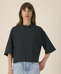 Women’s recycled cotton crop t-shirt. Set-in sleeves. 1x1 rib at neck collar. Self-fabric back neck tape. Twin-needle topstitching at armholes, sleeve cuffs and hem. Contains 50% GRS-certified recycled cotton and 50% OCS-certified organic cotton, certified by Control Union CB-CUC-1393082.